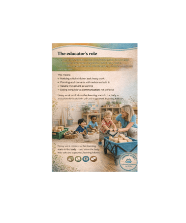 This reflective resource focuses on the educator’s role in designing environments that support regulation, rather than controlling behaviour. It highlights the importance of noticing children’s sensory needs, intentionally planning resistance-based experiences, and valuing movement as learning.
